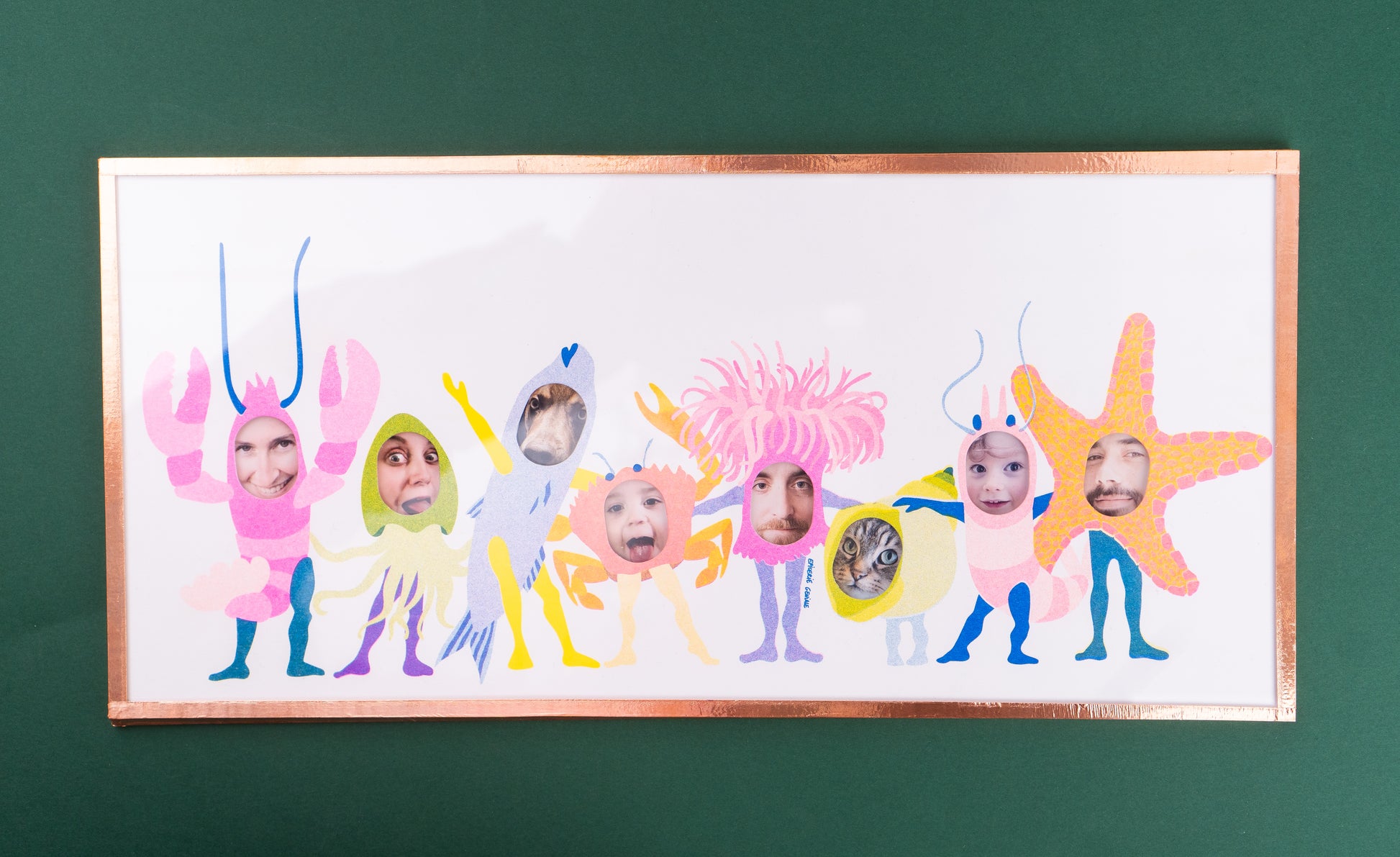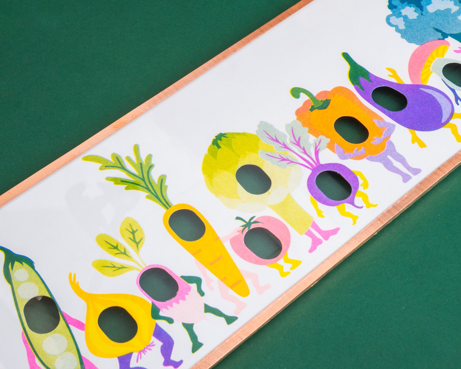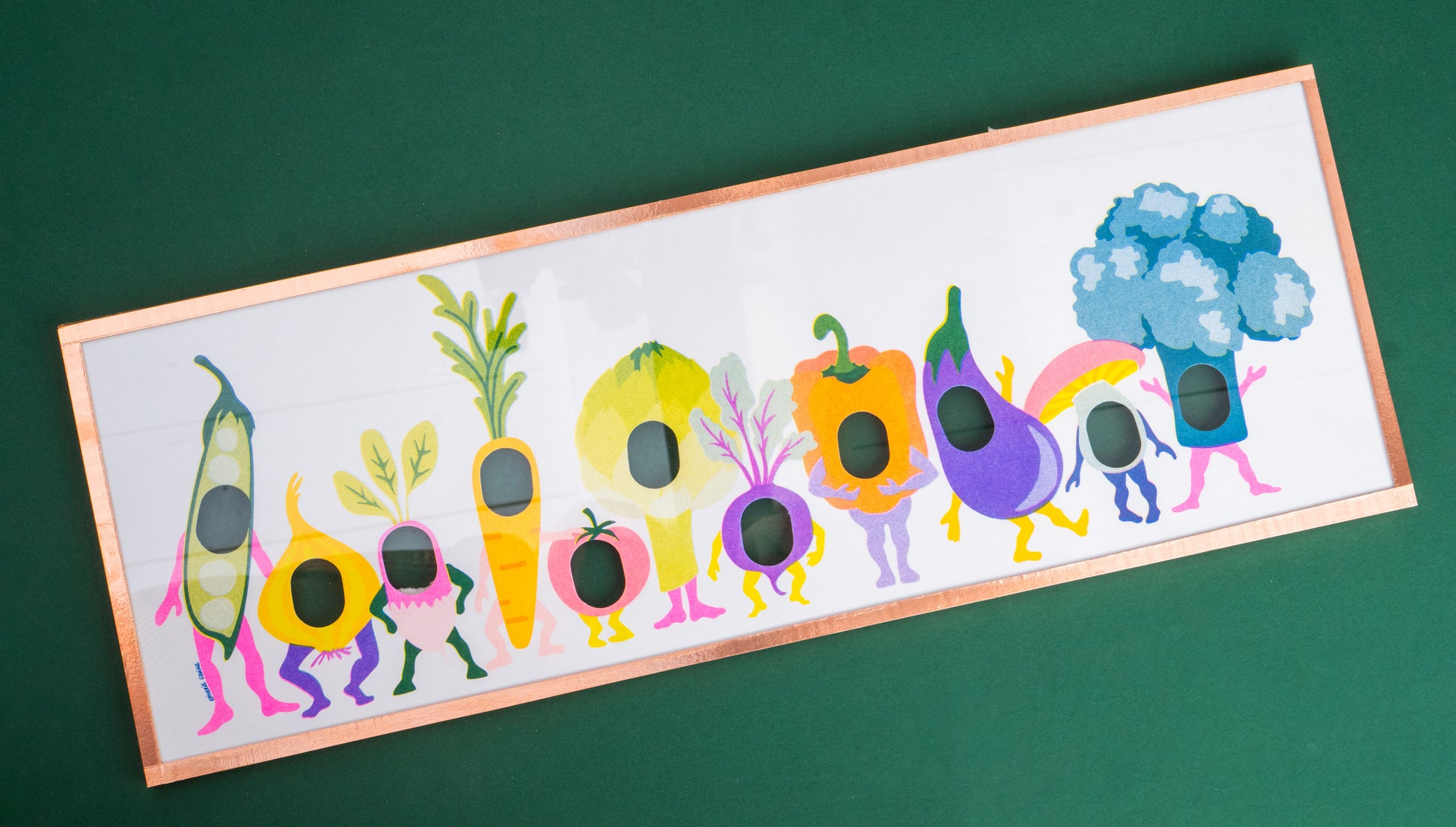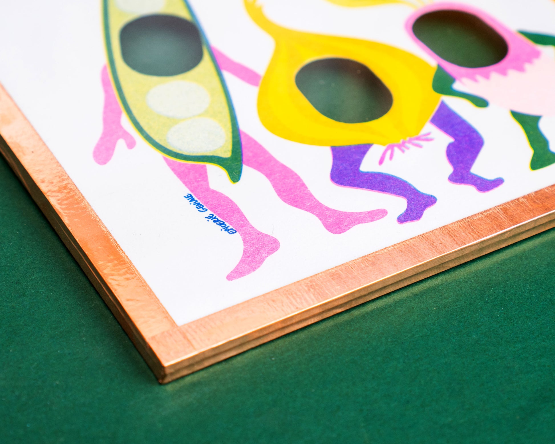 Disponibles en 15x30cm (fruits de mer) et 15x42cm (légumes), elles sont imprimées en risographie et encadrées en verre, MDF et cuivre.